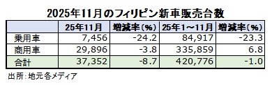 フィリピン自動車工業会(CAMPI)とトラック製造業協会(TMA)が18日発表した2025年11月の新車販売台数(乗用車、商用車)は前年同月比8.7%減の3万7352台と2カ月ぶりに減少した。前月比では6.7%減。1~11月の累計販売は前年同期比1%減の42万776台となった。CAMPIとTMAは25年通年の販売目標を前年比7%増の50万台に設定していたが、達成は困難な状況となった。24年通年の販売は8.7%増の46万7252台と4年連続で増加し、前年に続いて過去最多を更新したが、今年は5年ぶりに減少に転じる可能性が高い。地元各メディアが伝えた。