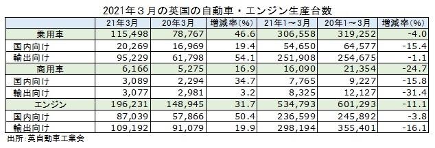 英自動車工業会(SMMT)が発表した2021年3月の乗用車生産台数は前年同月比46.6%増の11万5498台と19カ月ぶりに増加に転じた。SMMTのホーズ最高責任者は、比較対象となる20年3月の大半は工場が閉鎖されていたと指摘。過去1年間で約110億ポンド(約1兆6730億円)相当の生産が失われたとしている。1~3月の累計生産台数は前年同期比4%減の30万6558台となった。