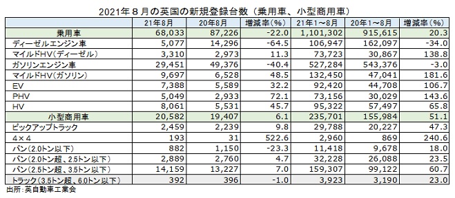 英自動車工業会(SMMT)が6日発表した2021年8月の乗用車の新規登録台数は前年同月比22%減の6万8033台と2カ月連続で減少した。SMMTのホーズ最高責任者は、8月は通常、英国の新車販売が伸び悩む月だとしたうえで、半導体不足が国内外の自動車生産に影響を及ぼしていることが反映されていると述べた。1~8月の累計は前年同期比20.3%増の110万1302台となった。