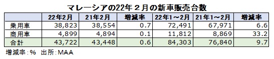 マレーシア自動車協会(MAA)が発表した2022年2月の新車販売台数(乗用車、商用車)は前年同月比0.6%増の4万3722台と2カ月連続で増加した。前月比でも7.7%増加。