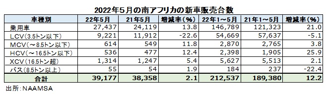 南アフリカ自動車工業会(NAAMSA)が1日発表した2022年5月の新車販売台数(乗用車、商用車)は前年同月比2.1%増の3万9177台と5カ月連続で増加した。1~5月の累計販売台数は前年同期比12.2%増の21万2537台となった。