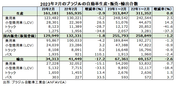 ブラジル自動車工業会(ANFAVEA)が発表した2023年2月の自動車生産台数(乗用車、小型商用車、トラック、バス)は前年同月比2.9%減の16万1181台と2カ月ぶりに減少した。1~2月の累計生産は前年同期比0.8%増の31万3847台となった。