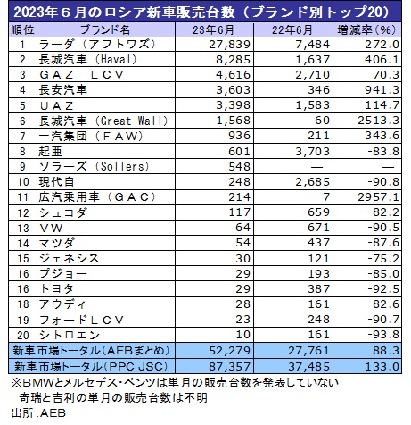 6月のブランド別の販売台数は、首位の自動車最大手アフトワズのラーダが272%増の2万7839台と5カ月連続で増加。長城汽車のHavalブランドが406.1%増の8285台で2位を維持した。GAZ LCVが70.3%増の4616台と4カ月連続で増加し、4位から3位に上昇している。