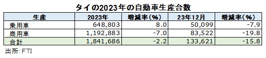 経済団体のタイ工業連盟(FTI)が29日発表した2023年通年のタイの自動車生産台数(乗用車、商用車)は前年比2.2%減の184万1686台と3年ぶりに減少し、FTIが目標としていた185万台には届かなかった。12月単月は前年同月比15.8%減の13万3621台と5カ月連続で減少した。