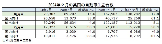 英自動車工業会(SMMT)が28日発表した2024年2月の乗用車生産は前年同月比14.6%増の7万9907台と6カ月連続で増加した。国内市場向けが58%増の2万658台と急伸し、輸出向けは4.6%増の5万9249台で、ともに6カ月連続で増加した。