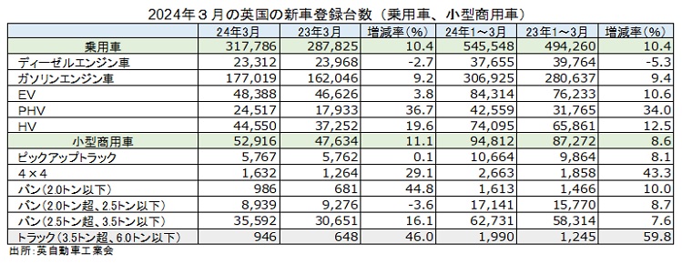 英自動車工業会(SMMT)が5日発表した2024年3月の乗用車の新規登録台数は前年同月比10.4%増の31万7786台と20カ月連続で増加し、3月としては19年以降で最高を記録した。英国では例年、ナンバープレートの表示が変更される3月と9月に新車販売が伸びる。第1四半期(1~3月)の累計は前年同期比10.4%増の54万5548台となった。