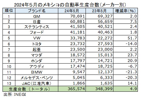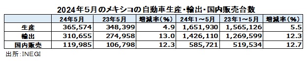 メキシコ国立統計地理情報院(INEGI)が6日発表した2024年5月の自動車生産台数(乗用車、ライトトラック)は前年同月比4.9%増の36万5574台と2カ月連続で増加した。1~5月の累計生産は前年同期比5.5%増の165万1930台となった。