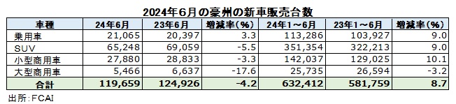 豪連邦自動車商工会議所(FCAI)が3日発表した2024年6月の新車販売台数(乗用車、商用車)は前年同月比4.2%減の11万9659台と15カ月ぶりに減少した。上半期(1~6月)の累計販売は前年同期比8.7%増の63万2412台で、同期の過去最高を記録している。