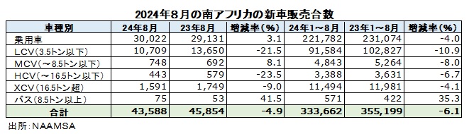 南アフリカ自動車工業会(NAAMSA)が発表した2024年8月の新車販売台数(乗用車、商用車)は前年同月比4.9%減の4万3588台と2カ月ぶりに減少した。1~8月の累計は前年同期比6.1%減の33万3662台となった。