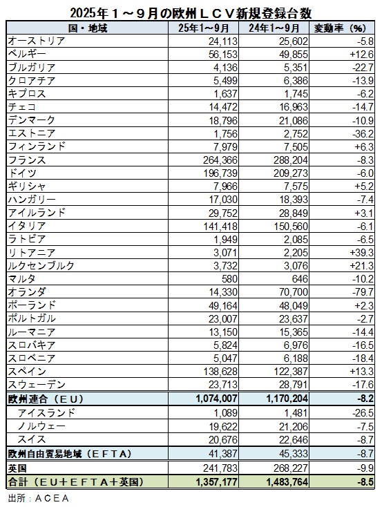 欧州自動車工業会(ACEA)が30日発表した2025年1~9月の欧州連合(EU)加盟国の小型商用車(LCV)新規登録台数は前年同期比8.2%減の107万4007台だった。EUと欧州自由貿易連合(EFTA=アイスランド、ノルウェー、スイス)、英国の新規登録台数の合計は8.5%減の135万7177台となった。