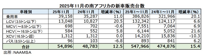 南アフリカ自動車工業会(NAAMSA)が1日発表した2025年11月の新車販売台数(乗用車、商用車)は前年同月比12.5%増の5万4896台と14カ月連続で増加した。1~11月の累計は前年同期比15.4%増の54万7966台となった。