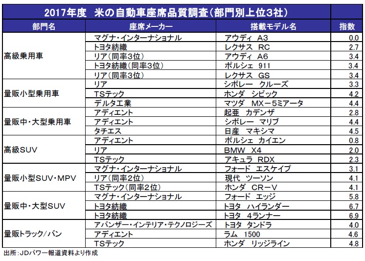 JDパワーは座席の品質や性能について100台当たりでどれだけの問題点が指摘されたかを調査し、指数化した。昨年11月~今年2月に2017年モデルの新車を購入してから90日以内のオーナー、7万7000人以上から回答を得ており、品質については指数が低いほど評価が高いことを示している。一昨年までは公表していた業界平均については今回も言及しなかった。