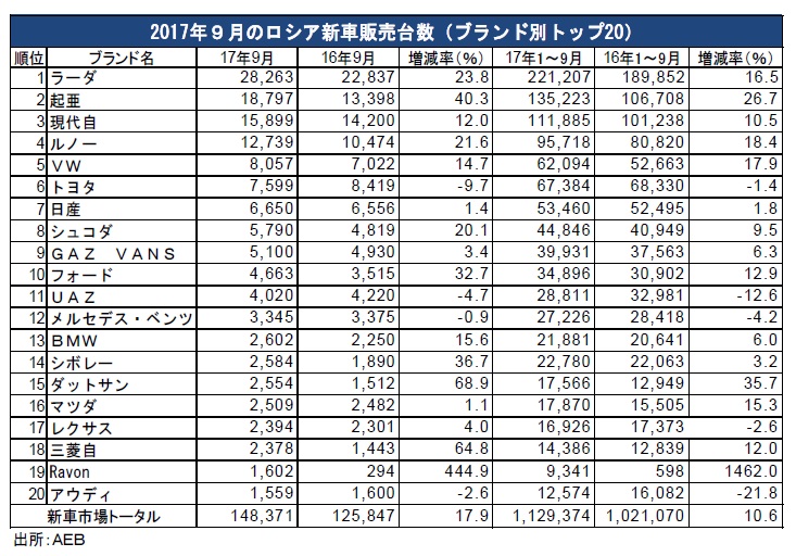 9月のブランド別の販売台数は、首位の最大手アフトワズのラーダが23.8%増の2万8263台と15カ月連続で増加した。起亜自動車は40.3%増の1万8797台と2けた増を続け、9カ月連続の2位となった。現代自動車は12%増の1万5899台で6カ月連続の3位。2けた増も6カ月連続となった。