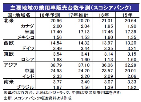 カナダの金融大手スコシアバンクは1月30日、世界の主要地域の乗用車販売台数予測を発表した。北米は2017年の2070万台から18年には1.26%増の2096万台、アジアは17年の3710万台から18年には4.6%増の3879万台に増えると予測している。