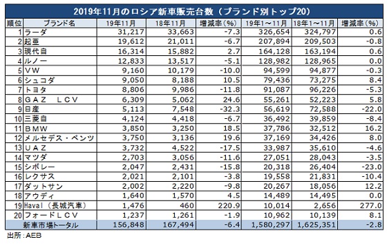 AEBの自動車製造業者委員会(AMC)のシュライバー会長は、12月の販売が前年同月の実績を上回る可能性は低いとしている。AEBは10月、19年通年のロシアの新車市場が前年比で2.2%減少すると予想していた。
