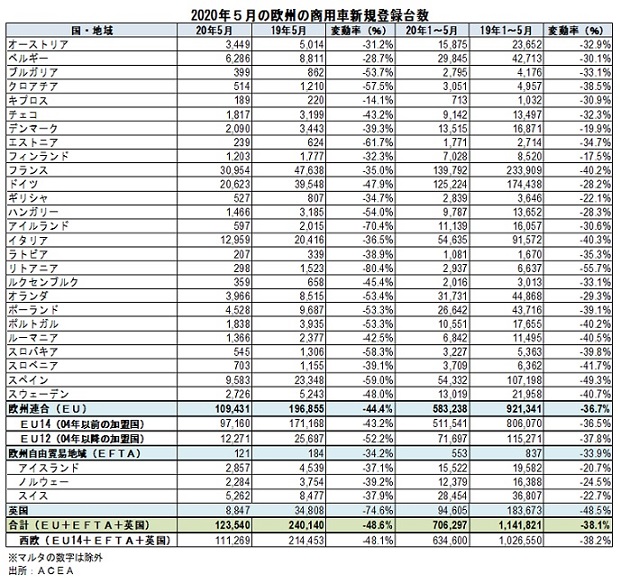 欧州自動車工業会(ACEA)が24日発表した2020年5月の欧州連合(EU)加盟国(英国とマルタを除く)の商用車新規登録台数は前年同月比44.4%減の10万9431台だった。EUと、アイスランド、ノルウェー、スイスからなる欧州自由貿易地域(EFTA)、EUを離脱した英国の新規登録台数の合計は48.6%減の12万3540台と5カ月連続で減少。減少率は4月の68.3%減よりは低下したものの、新型コロナウイルスの感染拡大が引き続き影響し、3カ月連続で2けた減となった。1~5月のEUとEFTA、英国の累計登録台数は前年同期比38.1%減の70万6297台だった。