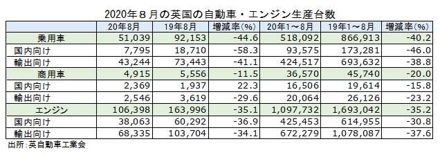 英自動車工業会(SMMT)が25日発表した2020年8月の乗用車生産台数は前年同月比44.6%減の5万1039台だった。12カ月連続の減少。4月の99.7%減から、5月は95.4%減、6月は48.2%減、7月は20.8%減と回復基調にあったが、再び減少率が拡大した。1~8月の累計は前年同期比40.2%減の51万8092台となった。
