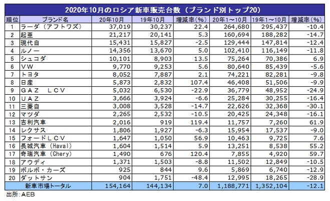 10月のブランド別の販売台数は、首位の最大手アフトワズのラーダが22.4%増の3万7019台と2カ月連続で増加した。2位の起亜自動車は5.3%増の2万1217台と3カ月連続の増加。3位の現代自動車は2.5%減の1万5431台と4カ月ぶりに減少に転じた。
